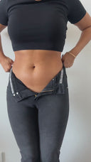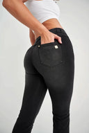 Incredibly comfortable form-fitting fabric with a waistband that contours your waistline securely, sitting higher than our traditional mid-rise styles. Looks like a traditional straight leg denim pant but in the worlds most comfortable Freddy fabric.