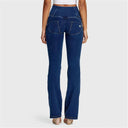 WRUP Denim - High Waisted - Bell Bottom Flare - Dark Blue + Yellow Stitching