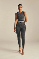 WRUP Denim Criss Cross Detail - High Waisted - Petite Length - Dark Grey Denim + Black Stitching