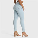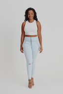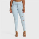 WRUP SNUG Distressed Jeans - High Waisted - Full Length - Baby Blue + Yellow Stitching